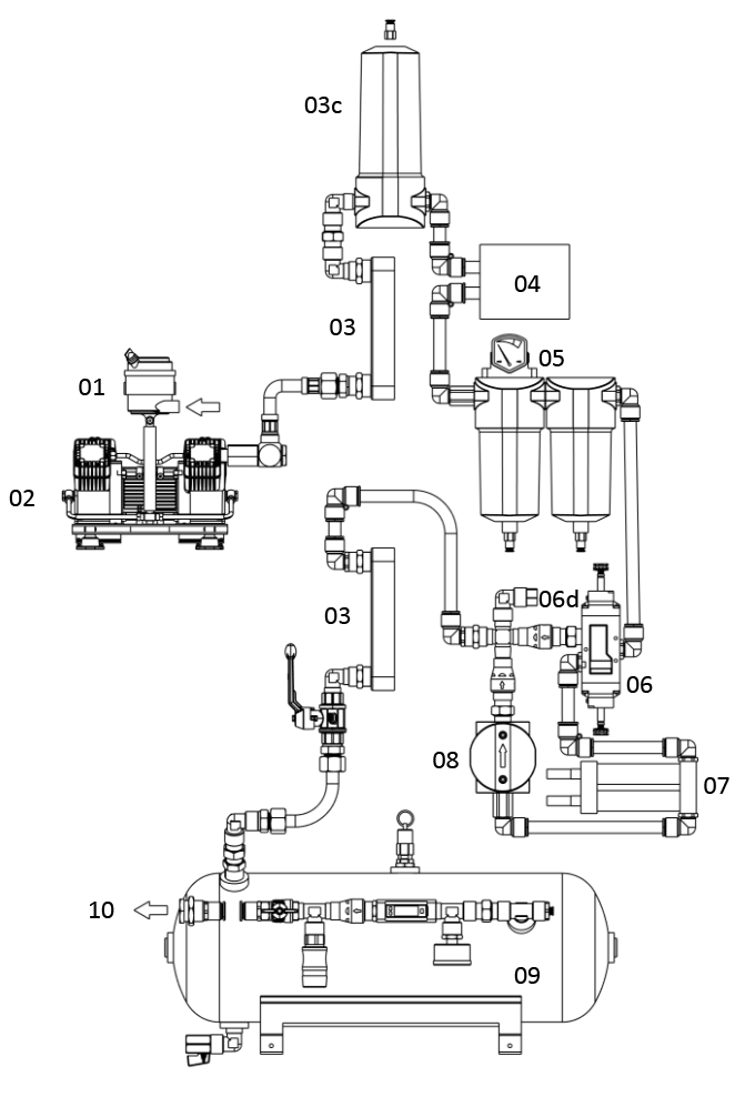 Schematische weergave 01 Luchtinlaatfilter02 Compressor03 Warmtewisselaar03c Cycloon04 Koeldroger05 Filters06 Ventiel07 Adsorbtiedroger08 Nafilter09 Tank10 Persluchtuitgang(11 Besturing)(12 Behuizing)(13 Verbindingen)