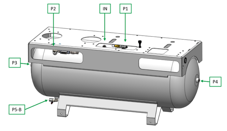 – Luchtleiding naar de druksensoren P5A en P5B op de PCB van de besturing