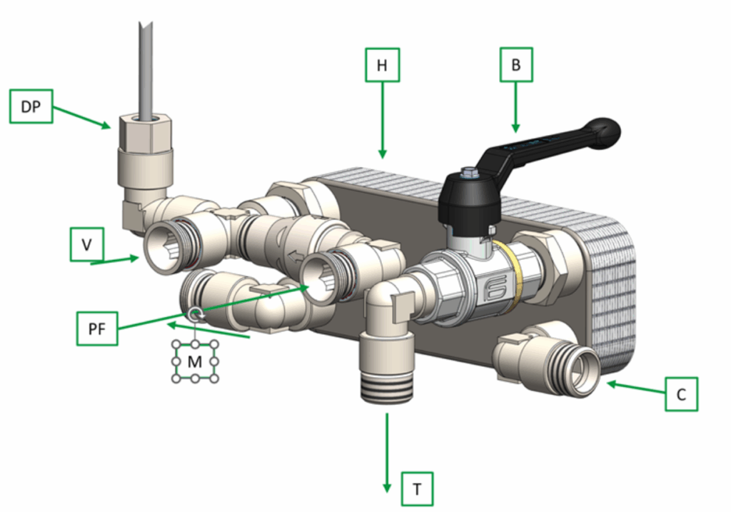 Platenwarmtewisselaar H met 4 poorten, fittingen